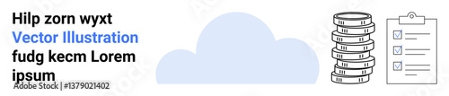 Blue cloud shape, data storage towers, and checklist clipboard. Ideal for data management, cloud technology, storage solutions, task organization, digital security, data analysis simple landing page
