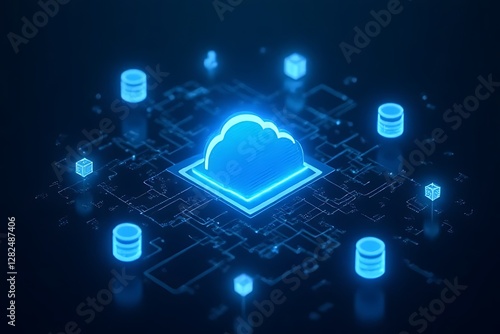 Blue cloud symbol connects to databases, representing advanced cloud computing technology systems.