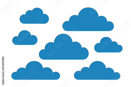 Blue clouds silhouette isolated collection. Simple flat icon set. Weather symbol, sky sign. Cloud computing technology concept for data storage, web, network. Speech bubble.