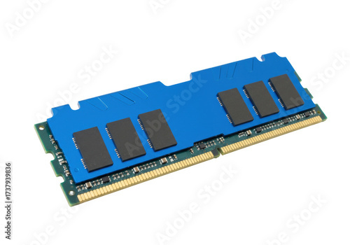 Blue computer RAM memory module isolated, DDR4 component for PC upgrade and high performance computing on transparent background