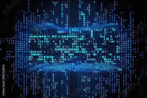 Blue digital binary code creating abstract pattern on computer screen, generative ai