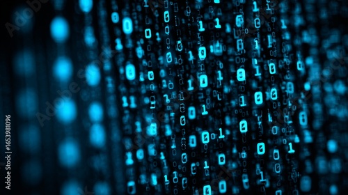 Blue digital binary code data flowing across futuristic computer screen background with glowing technology matrix and cyber programming concept