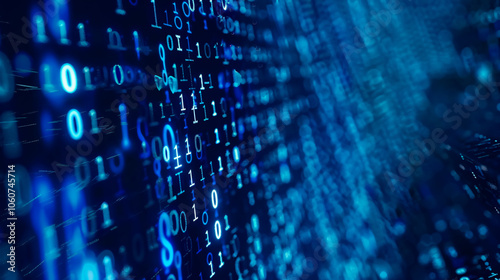 Blue digital binary data displayed on a computer screen background, representing technological and digital concepts.