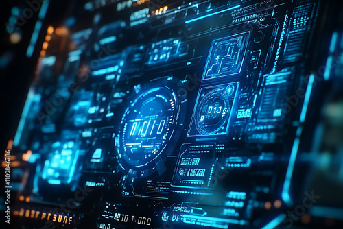 Blue digital binary data on a computer screen, creating a futuristic, high-tech atmosphere with flowing numbers and abstract patterns