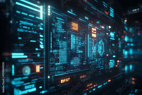 Blue digital binary data on a computer screen, creating a futuristic, high-tech atmosphere with flowing numbers and abstract patterns