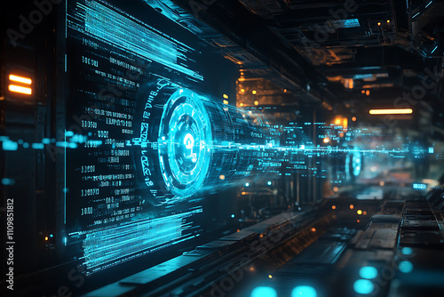 Blue digital binary data on a computer screen, creating a futuristic, high-tech atmosphere with flowing numbers and abstract patterns