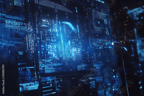 Blue digital binary data on a computer screen, creating a futuristic, high-tech atmosphere with flowing numbers and abstract patterns