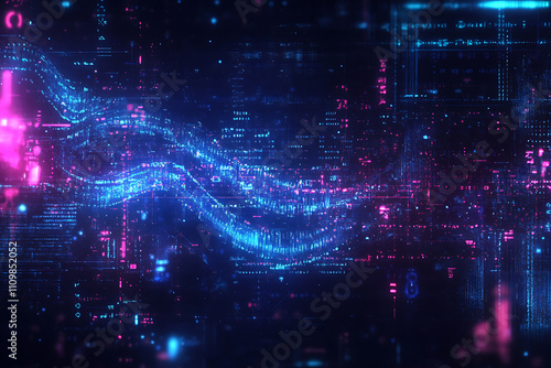 Blue digital binary data on a computer screen, creating a futuristic, high-tech atmosphere with flowing numbers and abstract patterns