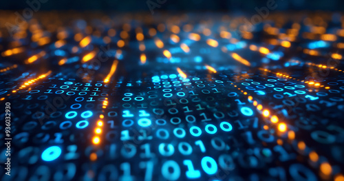 Blue digital binary data on computer screen, Neon binary data stream.