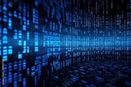 Blue digital code cascading down dark background. Suitable for technology, cybersecurity, data encryption, programming concepts in digital design projects. Generative AI
