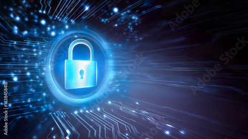 Blue Digital Padlock with Glowing Circuit Lines on Dark Background