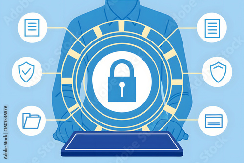 Blue digital security concept with padlock and icons