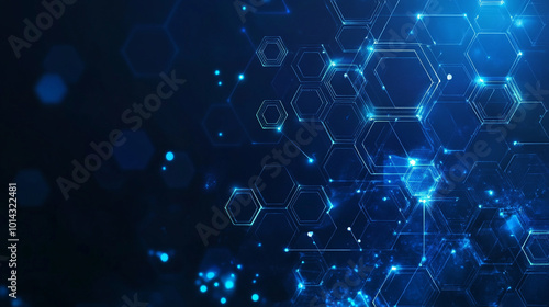 Blue geometric shape abstract technology background: modern digital design featuring intricate patterns, Abstract blue background with hexagons and connections and glowing particles.