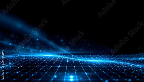 Blue glowing digital waves with sparkling particles, dark background