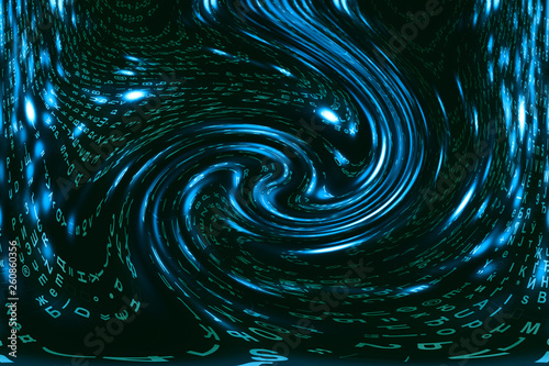 Blue green matrix digital background. Distorted cyberspace concept. Green characters fall down in wormhole. Hacked matrix. Virtual reality design. Complex algorithm data hacking. Cyan digital sparks.