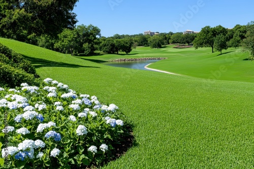 Blue Hydrangeas and Lush Green Landscape Under a Sunny Sky