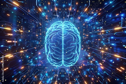 Blue illuminated brain surrounded by digital circuitry