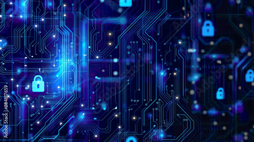 Blue integrated circuit with locks symbolizing cyber security and data protection firewall elements to prevent hacker attacks modern and secure digital background