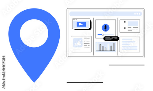 Blue location pin beside a digital dashboard with charts, notifications, video thumbnail, and layout elements. Ideal for analytics, navigation, geolocation, technology, data visualization user