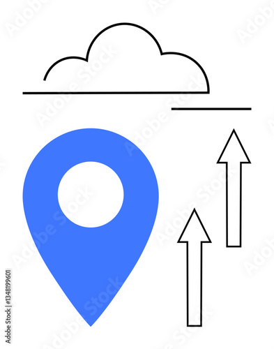 Blue map pin, cloud symbol, and upward arrows emphasizing location technology, cloud computing, data growth, development trends. Ideal for navigation, mobility, digital progress innovation global