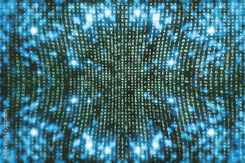Blue matrix digital background. Abstract cyberspace concept. Characters fall down. Matrix from symbols stream. Virtual reality design. Complex algorithm data hacking. Cyan digital sparks.