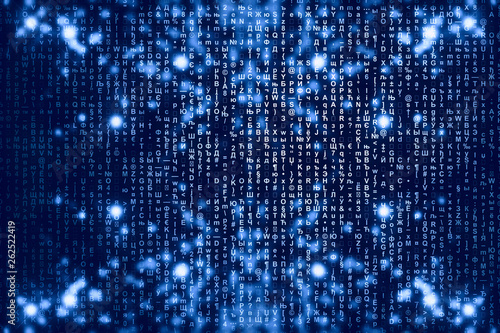 Blue matrix digital background. Abstract cyberspace concept. Characters fall down. Matrix from symbols stream. Virtual reality design. Complex algorithm data hacking. Cyan digital sparks.