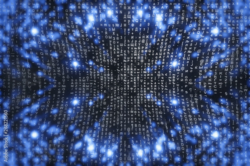 Blue matrix digital background. Abstract cyberspace concept. Characters fall down. Matrix from symbols stream. Virtual reality design. Complex algorithm data hacking. Cyan digital sparks.