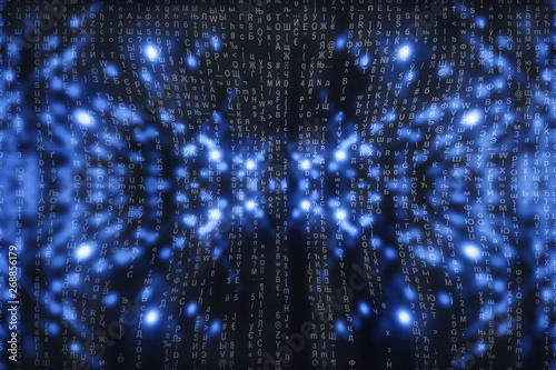 Blue matrix digital background. Abstract cyberspace concept. Characters fall down. Matrix from symbols stream. Virtual reality design. Complex algorithm data hacking. Cyan digital sparks.