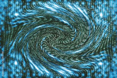 Blue matrix digital background. Distorted cyberspace concept. Characters fall down in wormhole. Hacked matrix. Virtual reality design. Complex algorithm data hacking. Cyan digital sparks.