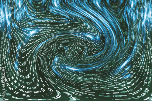 Blue matrix digital background. Distorted cyberspace concept. Characters fall down in wormhole. Hacked matrix. Virtual reality design. Complex algorithm data hacking. Cyan digital sparks.