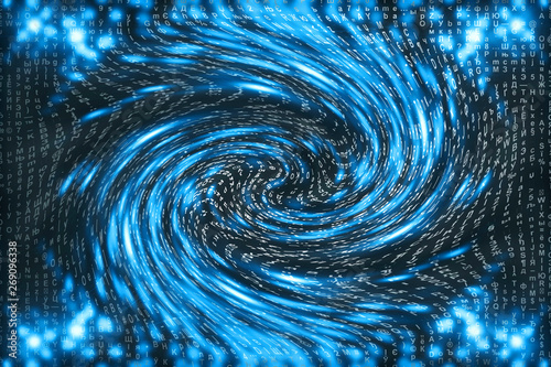 Blue matrix digital background. Distorted cyberspace concept. Characters fall down in wormhole. Hacked matrix. Virtual reality design. Complex algorithm data hacking. Cyan digital sparks.