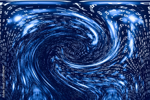 Blue matrix digital background. Distorted cyberspace concept. Characters fall down in wormhole. Hacked matrix. Virtual reality design. Complex algorithm data hacking. Cyan digital sparks.