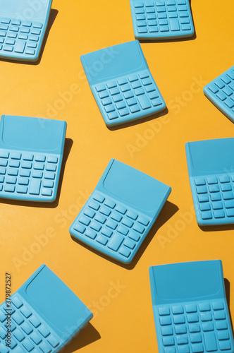 Blue pocket calculators on orange background.