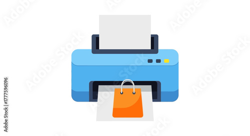 Blue printer printing an orange shopping bag icon on paper.