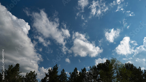 Blue sky with scattered clouds over forested area.