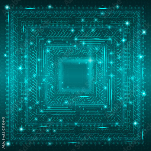 Blue technological background with square elements of a stylized microcircuit. Vector illustration.