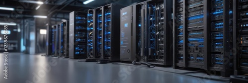 Blue web network system with servers, routers, cables and laptops, communication systems, networking, server