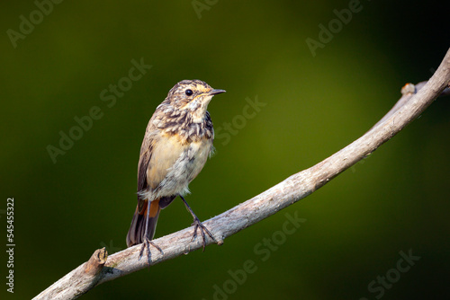 Bluethroat, Luscinia svecica. Chick sitting on a branch
