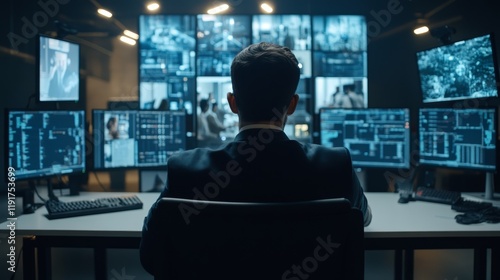 Boosting productivity, man navigating multiple monitors in a modern workspace