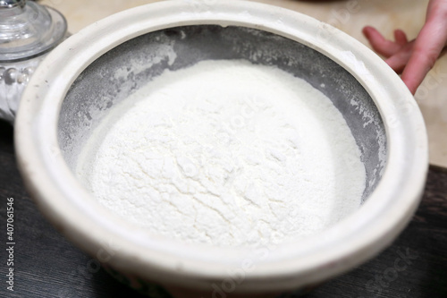 Bowl with flour on table