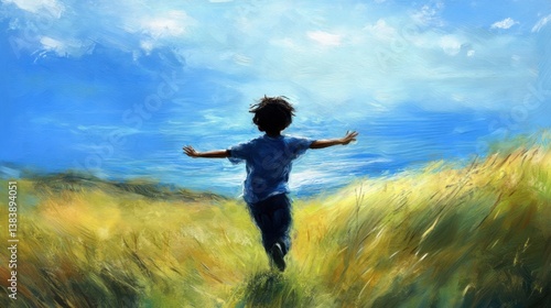 Boy Running Joyfully Through Golden Fields Under a Bright Sky