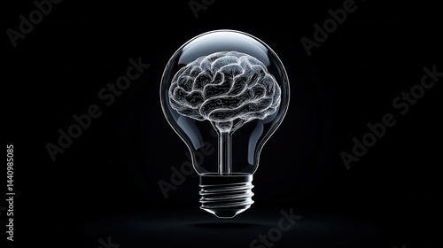 Brain inside lightbulb icon in black outline, creativity and intelligence concept