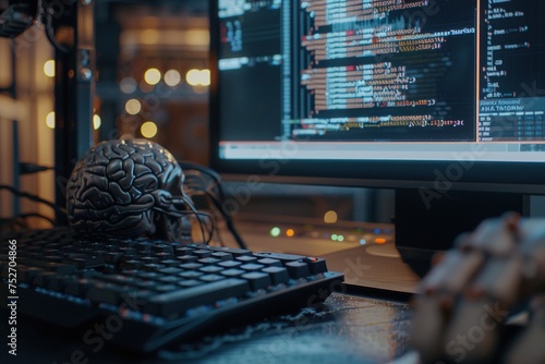 Brain model on desk with computer screens displaying code. Neuroscience research, Artificial intelligence development, Educational software. AI Generated.