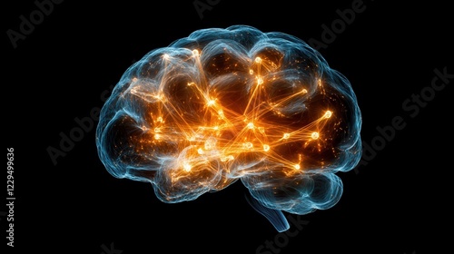 Brain with glowing orange and blue lights representing neural activity and technology