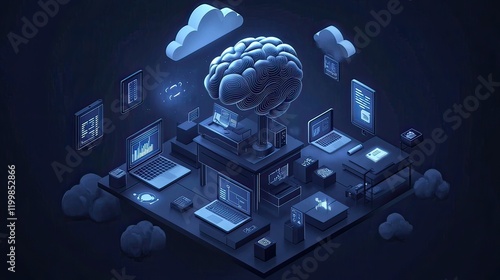 Brain-powered network, digital devices, cloud computing, data analysis, dark background, tech concept
