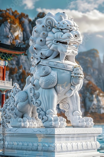 Breathtaking Chinese-themed Travel Advert with Majestic Stone Lion Guardians and Ornate Paper-Cut Window Designs