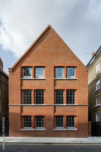 Brick building with modern design features stands against a cloudy sky in an urban setting, showcasing architectural elements and a distinct triangular roof