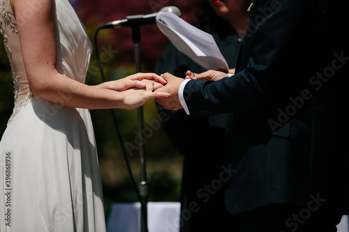 bride holding groom's hand during wedding ceremony
