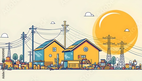 Bright and sunny urban landscape featuring colorful houses and power lines in a tranquil neighborhood setting Generative AI
