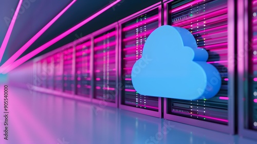 Bright blue cloud icon with servers in data center, representing cloud computing and technology infrastructure.